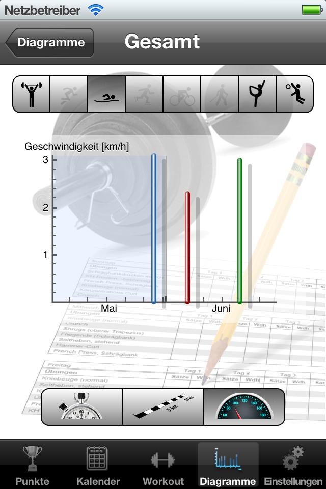 Verfolge Dein Training auf einem Kalender und beobachte in der Diagramm-Ansicht wie sich Deine Leistung immer weiter verbessert.